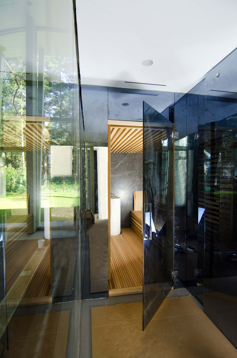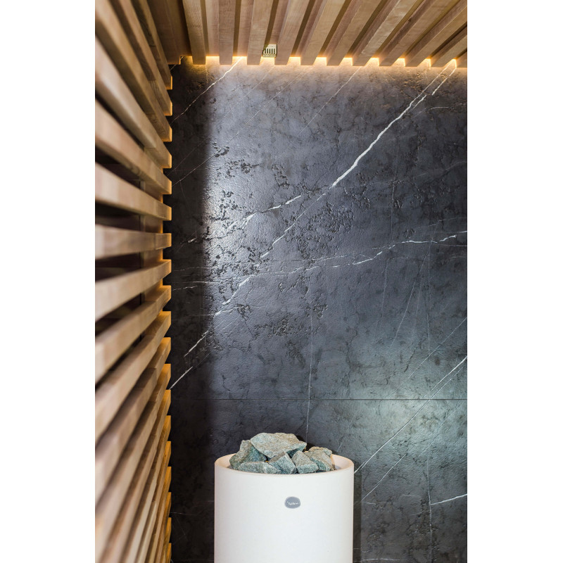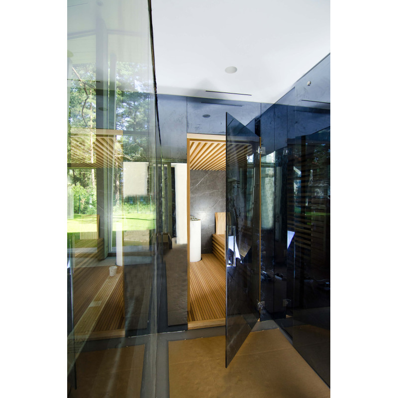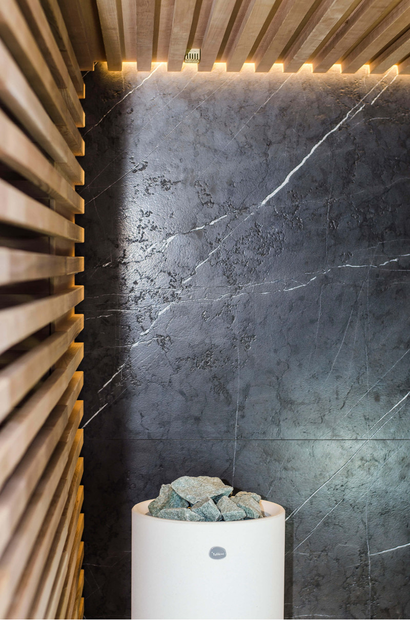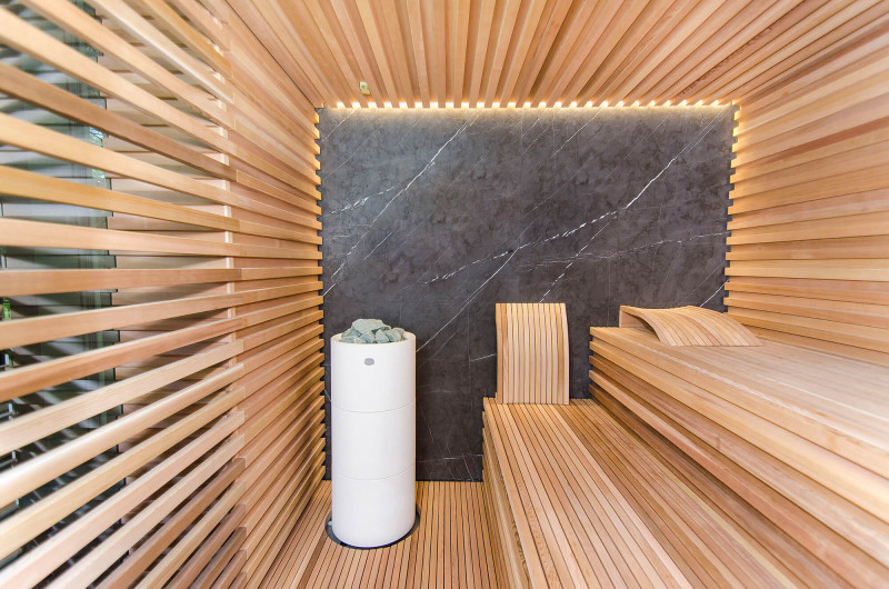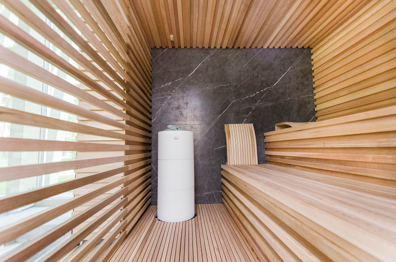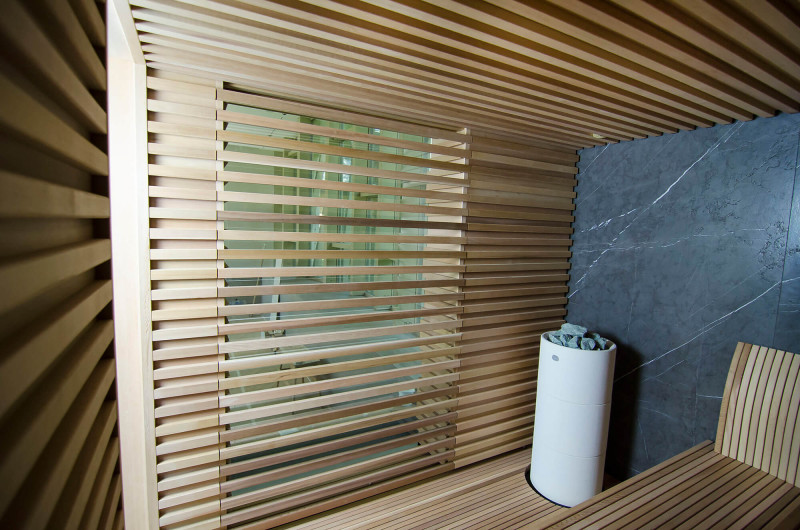 Задняя стенка сауны отделана эксклюзивным дизайнерским итальянским мрамором, красоту которого подчеркивает установленная вокруг него светодиодная подсветка. Украшением боковой стены сауны является стеклянное окно-витрина, которое закрывается съемной ажурной решеткой. Сауна выходит на спа-зону, на большой бассейн. Освещение стен и потолка сауны осуществляется герметичной светодиодной лентой теплого белого цвета. Безрамные стеклянные двери.