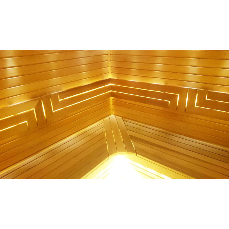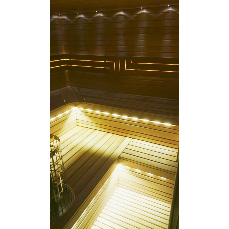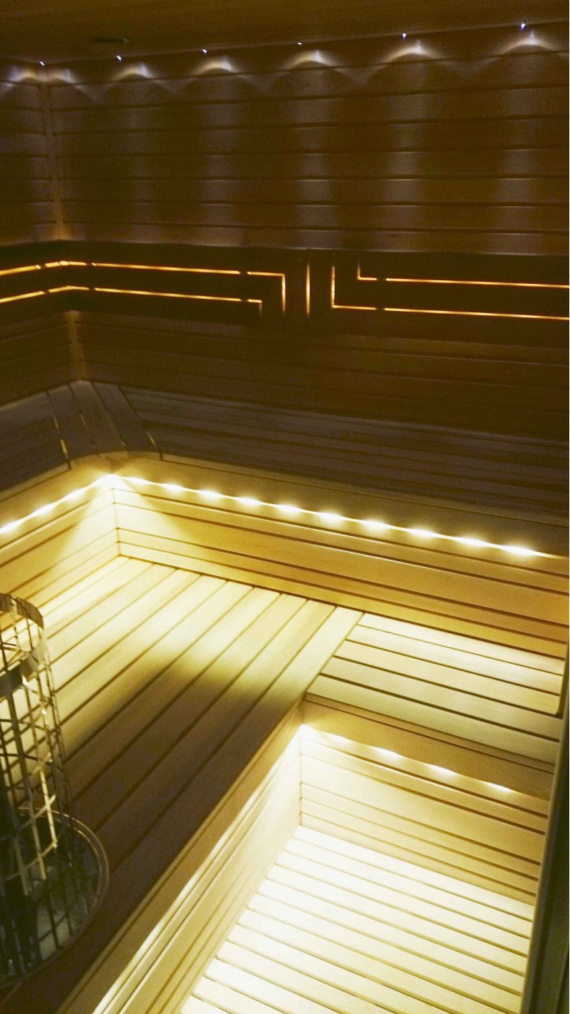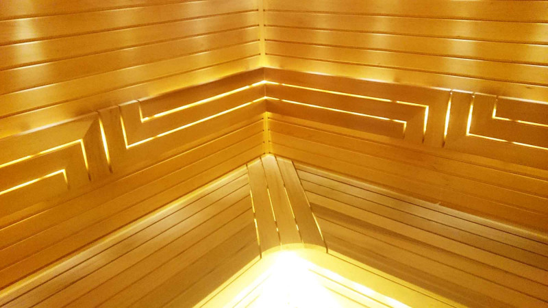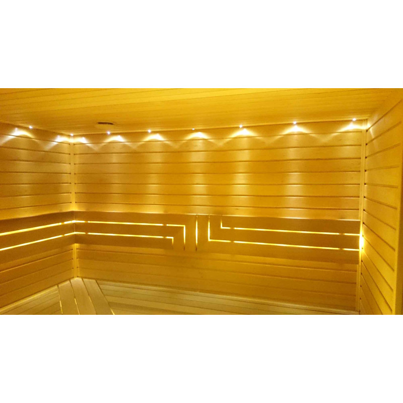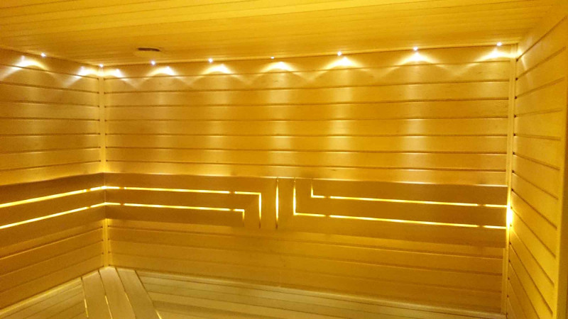 На потолке установлена эксклюзивная светодиодная подсветка «Солнышко», установлены светодиодные ленты под скамейки и спинки, теплый белый цвет. Благодаря освещению обеспечивается часть расслабляющего эффекта сауны.