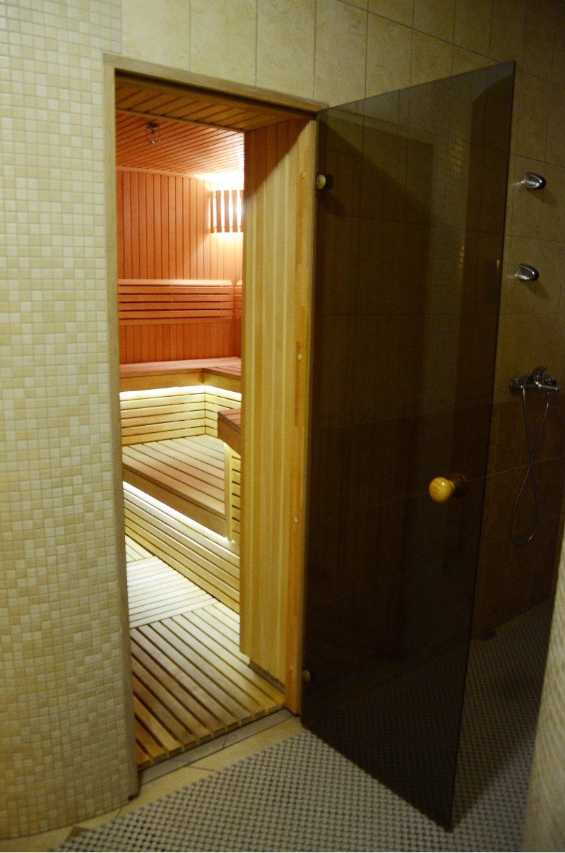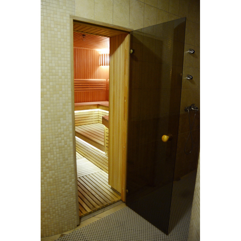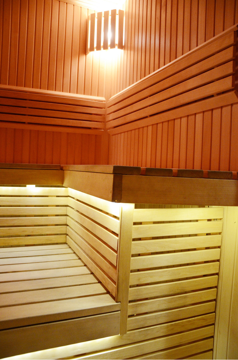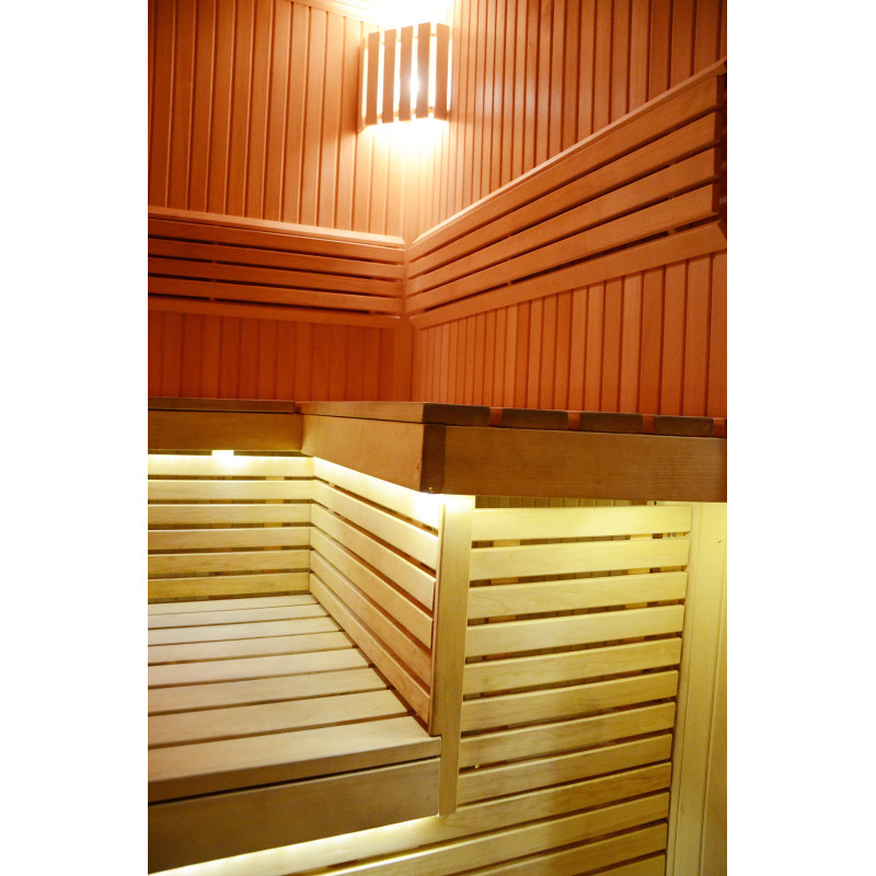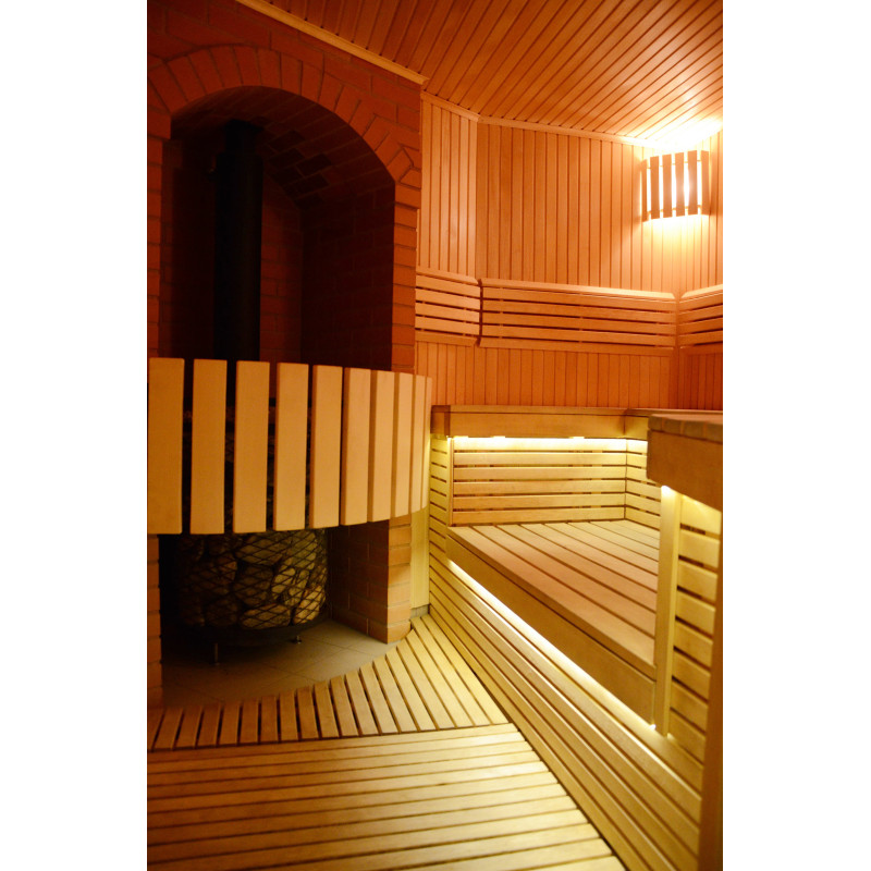 Стены и скамейки сауны выполнены из высококачественной обшивки из древесины липы, которая отличается ярким красивым цветом и источает приятный природный аромат. Крышки светильников, спинки и оригинальное защитное ограждение вокруг каменки также выполнены из дерева.